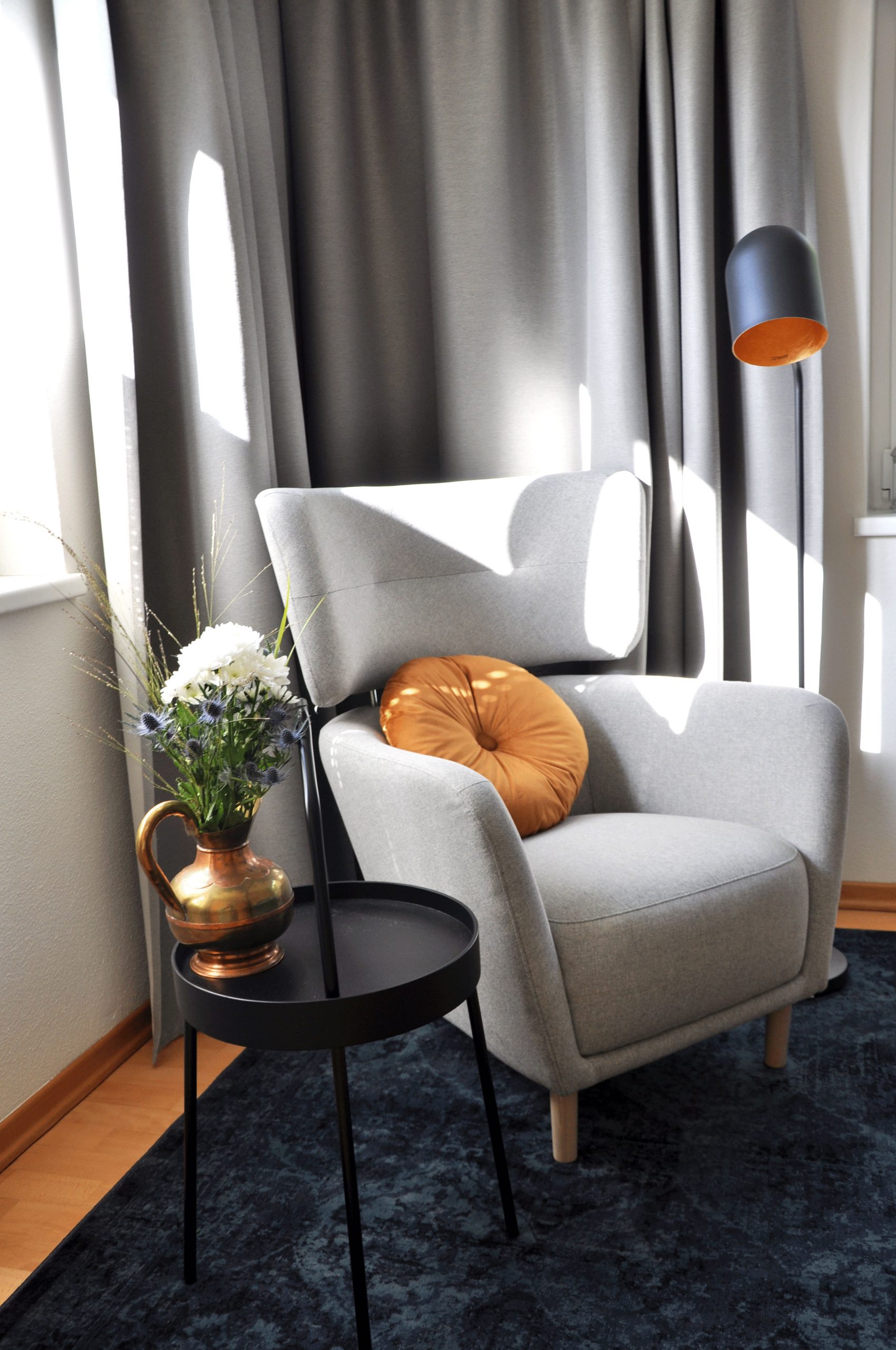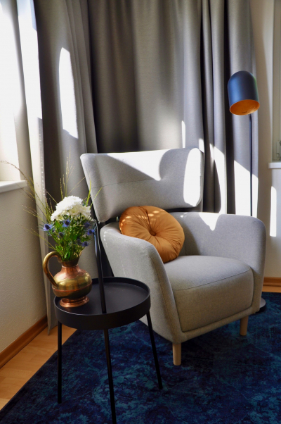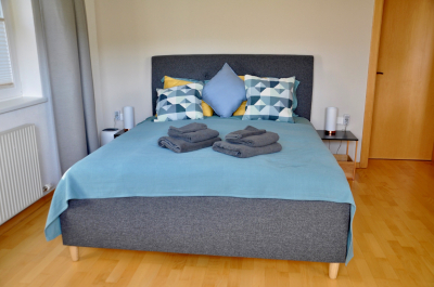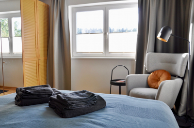 Das Schlafzimmer ist mit einem bequemen Queensize-Bett und einem gemütlichen Sessel ausgestattet. Die Wohnung ist perfekt für eine oder zwei Personen.
