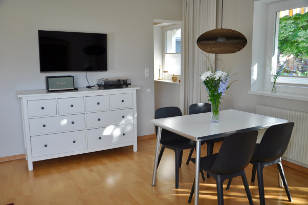 Die 2-Zimmerwohnung im Erdgeschoss wurde 2023 renoviert, neu eingerichtet und bietet einen unglaublichen Blick auf Wälder, Felder, die Tiroler Nordkette und auf einen wunderschön angelegten Garten.
